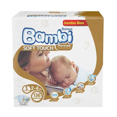 Sanita Bambi Baby Diapers Size 1 Newborn 24kg White Jumbo Box Pack of 136