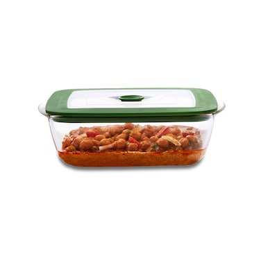 Borosil Easy Grip Square Cake Dish With Green Lid, Microwave, Oven And Dishwasher Proof, White, 1L