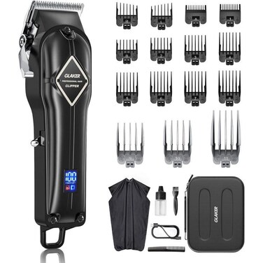 Glaker K11S Barber Clipper Hair Cutting Kit with 15 Guide Combs for Haircut, Trimming & Grooming - Black - K11S