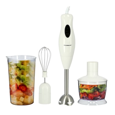 The Olsenmark Hand Blender has a variable one-hand speed wheel for maximum precision for performance control - simply adjust the speed wheel with your thumb. Chopper accessory (500 ml) For your big jobs: Chops and minces anything from meats and cheeses to onions, herbs, garlic, vegetables, nuts or dried fruits has never been easier - with results in just seconds. Whisk accessory quickly and easily whips, beats and stirs eggs, cream and fluffy desserts - from low speed to high.You've never seen faster results for whipping cream, beating eggs, mixing cakes or stirring Hollandaise sauce, as well as making instant, homemade desserts. For blending and mixing you can either use the 500 ml cup together with the hand blender to make a fruit smoothie or mix your favourite drink - or use the whisk attachment to beat eggs, eggs whites, cream or make creamy sauces. Box Contains: 1 x Olsenmark Hand Blender, 1 x 500 ml cup, 1 x 500 ml chopper, 1 x whisk.Detachable rod - The detachable stainless steel rod is easy to clean and takes up minimal storage space.Efficient & Quiet - Olsenmark hand blender sharp stainless steel blades and powerful copper motor are perfect for cutting hard ingredients up efficiently. An ergonomically designed handle provides a comfortable and soft grip without the risk of slipping. Also, it has low noise so it won't disturb your kids or neighbourhood.Abs Material - The body of this Blender is made of ABS material. ABS stands for Acrylonitrile Butadiene Styrene which is food-grade material, environmentally safe and durable. It is a polymer known for its strength and durability. This device is resistant to breakage and built to give a long-term performance.Other Specifications Power Supply Range - 200-240VFrequency Range - 50/60Hz