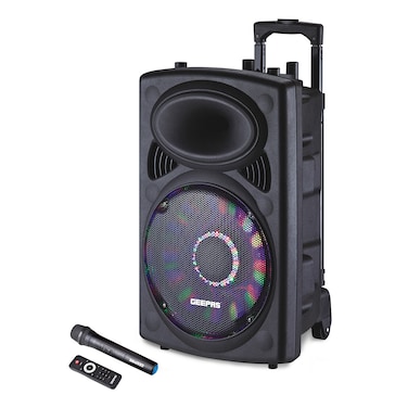 Hey! I can make you dance to my tunes.Create an atmosphere of your dreams wherever you want!A powerful speaker with a breath-taking sound!This speaker with a compact design is ideal for listening to music anywhere, alone, with friends and family! It's a 12'' woofer and its tweeter guarantee a clear and powerful sound. It turns into karaoke thanks to the included microphone to liven up all your parties.Adjust the sound of your music as you like thanks to the many settings possibilities: Adjusting the bass, treble, and equalizer to adjust the musical style.EASY CARRY TROLLEY SPEAKER - This speaker with multicoloured Disco lights is ideal for illuminating your evenings. Thanks to its telescopic handle and integrated wheels, you can take the speaker anywhere without effort!MULTIPLE FEATURES - This mp3 player is multi-functional and can be connected via USB, has a Micro SD card slot and can also be connected via Bluetooth. This makes it compatible with your iPhone, iPad, and Computers. It also has an FM radio and a line-in function. Now you can listen to your favourite radio channel with ease.OTHER FEATURES AND SPECIFICATIONS - Output power:40000W PMPO, Built-In Media Player with SD/USB Inputs and a Wireless Microphone & Remote Control. Retractable Suitcase Style Pulling Handle For Easy TransportationCONNECT EFFORTLESSLY AS YOU WISH! - This light speaker connects easily wirelessly with all devices equipped with Bluetooth function. It also has a USB port, a micro-SD / AUX-IN jack (with cable not included) to connect an external audio player.