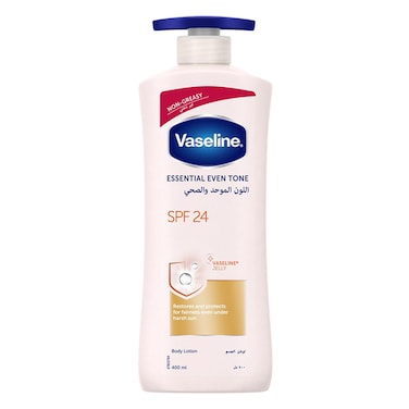 - Your skin faces daily damage from heat, sunshine, and environmental pollution. Daily moisturising with Vaseline Essential Even Tone body lotion helps to reverse the effects of sun damage and protect your skin against further damage. This SPF 24 body lotion helps to restore your skin so that it looks and feels soft, healthy and radiant, and protects against further damage by the sun's rays. This lotion protects against both UVA and UVB rays, keeping your skin safe from harm even in harsh, sunny conditions. Vitamins B3, E and C help your skin to recover from previous damage, and restore a smooth, even tone so your skin looks radiant and fresh. Vaseline jelly helps to restore your skin's moisture and keeps it deeply moisturised for ongoing protection against dryness. The light and non-greasy formula is quickly absorbed to help replenish your skin's moisture from deep within. This brightening and moisturising body lotion for all skin types can be used daily on hands and body to help you achieve radiant, glowing skin that feels soft and smooth. Vaseline's expertise in skin care has stood the test of time, and our Vaseline Jelly has been trusted for skin protection for over 150 years. Trust Vaseline to soothe and protect your skin. *Within the stratum corneum.