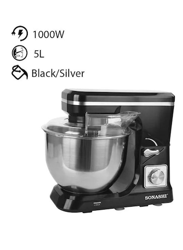 Sonashi 3 In 1 Stainless Steel Bowl Stand Mixer 5L, 1000W, SMX-140, Black/Silver