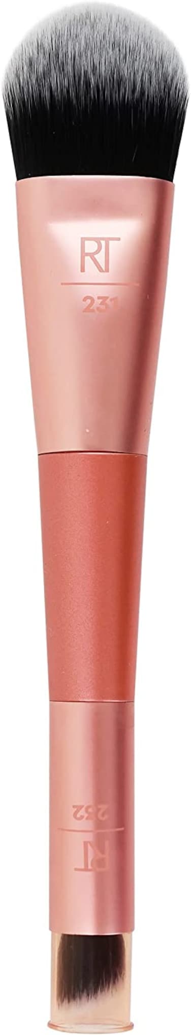 Dual Ended Cover & Conceal Foundation and Concealer Brush by Real Techniques. This Dual Ended Cover & Conceal brush has two different heads specially designed to apply both liquid, fluid or cream makeup on one side, and concealer, both liquid, fluid or cream on the other. A 2-in-1 brush with easy-to-clean synthetic bristles, perfect for a flawless finish. This dual brush includes: At one end, a 231 base brush, rounded. And at the other end, concealer brush 232, angled. It has a removable cap, ideal to protect the brush and facilitate its storage.