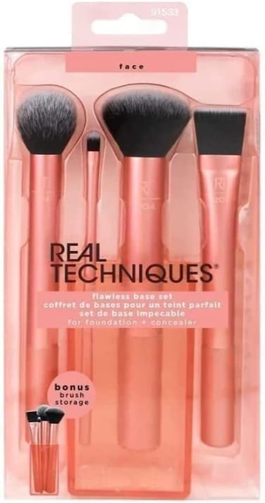 2 Sets of brushes: Flawless Base Set and Enhanced Eye Set. About the Brushes Designed with pro makeup artist Samantha Chapman, Real Techniques brushes combine high-tech materials with innovative design to make creating a pixel-perfect look easier than ever. Synthetic bristles are ultra plush and smoother than the hair you'll find in other brushes. Since our bristles are synthetic, it's 100% cruelty-free. The soft fibers help create a flawless, high-definition finish in any type of light from sunlight to harsh indoor lighting. The color-coded system corresponds to the key steps of makeup application so you can create a flawless base, enhanced eyes, and the perfect finish like a pro. Each brush head is hand-cut to the perfect shape, allowing for precise application from dense coverage to a soft, delicate finish. The collection is suitable for a wide range of products and every makeup need from powders, creams, and liquids to mineral makeup, highlighter, and shimmer. Brush names on the handles make for easy reference when creating your favorite look.