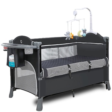 - • Use as Next to Mom Sleeping Cot, Playard, Rocker and Changing Station • Comfortably Secure the Bassinet with the King or Queen size bed with the hooks and belts provided in the package. Baby can sleep next to your bed safely. Easy to manage for night time feeds and when the baby wakes up. • Detachable Rocker - Rock your baby for a comfortable sound sleep. • Comes with 2nd floor and mattress. • Perfect for New Born, Infants and Toddlers can hold upto 20 Kg baby weight comfortably. • Zipper Enclosed Side opening for the baby to get in and out of the Playard • Dedicated Luxury Organizer to keep Nappies, Tissues, Rattles or Toys etc. • Detachable Changing station with elevated sides and safety belts for extra safety • Two small wheels to enable easy maneuvering • 4 bright colored Musical and Rotating Toys for playing and grabbing - perfect to develop hand eye co - ordination and motor skills • 360 ° Mosquito Net Cover • Easy to install and can be folded into a compact Carry Bag • Packing includes 4 x Toys, 1 x Bassinet, 1 x Diaper Change Station, 1xDiaper Organizer, 1xMattress for second floor, 1 x Carry Bag, 1xMosquito net