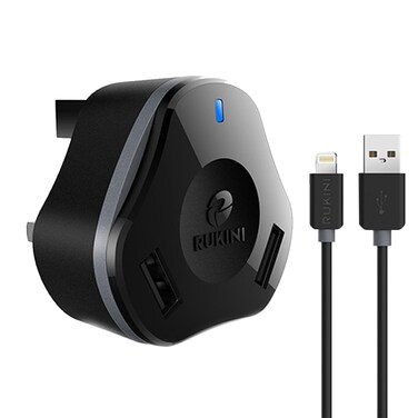 Rukini dual USB wall charger with lightning to USB charge & sync cable, 1.5M, Black