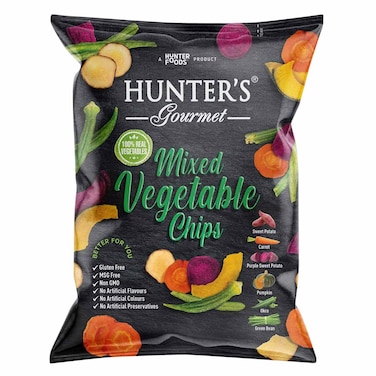 - The Hunter's Gourmet Mixed Vegetable Chips is a colourful, crunchy mix of veggies, these vegetable chips, packed with fiber, are a healthy snack option containing less fat than regular chips.