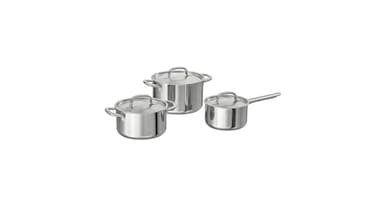Works well on all types of hobs, including induction hob. The pot handles are designed to reduce heat transfer. Made from stainless steel that is durable and easy to clean. The wide bottom with an edge makes the pot perfectly suitable to use on both gas and induction hobs. Thick base with one layer of aluminium between two layers of stainless steel. Gives an even and energy-efficient heat, which reduces the risk of food burning and sticking. Thanks to the smart design of the handles, you can stack the smaller pots in the larger ones from the same series. They take very little space, so you have room for other things in your cabinet. The pot has a rounded interior, which makes stirring and beating easy. The pot and saucepans have lids made from stainless steel. This makes the heat reflect down into the cookware, which brings the contents to the boil more quickly and reduces energy consumption. Can also be used in the oven since it is made entirely of metal. Using the lid brings the contents of the pot to a boil faster, so that you can save time, energy and money while lowering your environmental impact. Steam vent reduces pressure so that food does not easily boil over. You can cook food on a low heat and save energy because the stainless steel in the pan absorbs heat well and retains it for a long time. Two handles make it easy to lift the pan. Comprises: 1 pot with lid (5 l), 1 pot with lid (3 l) and 1 saucepan with lid (2 l).