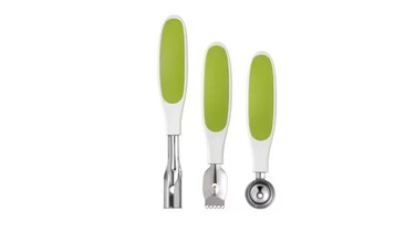 Makes it easy to core apples etc. Makes it easy to remove the zest of citrus fruits in strips e.g. for drinks or salads. Makes it easy to form balls e.g. of fruit, butter or icecream. Comprises: Corer 21 cm, melon baller 17 cm and lemon dresser/zester 19 cm. Wash this product before using it for the first time.
