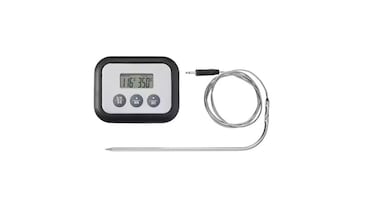 Magnet on back - sticks to a fridge etc. Batteries is sold separately; 1 pc LR03 AAA 1.5V required. Measures temperatures up to 250°C/480°F. The cord is heat-resistant up to 250°C/480°F.