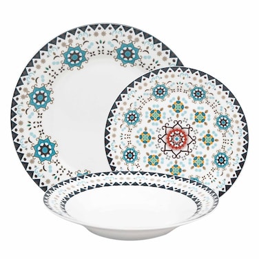 Made from high-quality ceramic, this dinner set features a unique printed rim design that adds a pop of colour to your meals. The set includes 12 pieces, including dinner plates, salad plates, and bowls, making it perfect for both everyday use and special occasions.