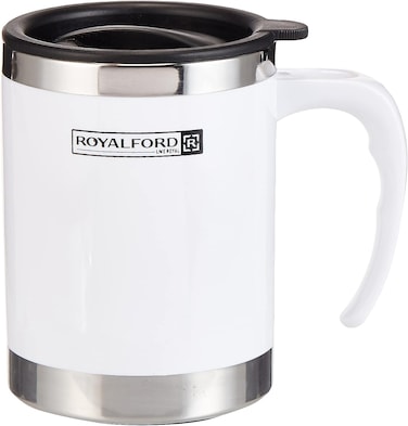 - <li>ELEGANT DESIGN – The Royalford travel mug has an elegant design which is suitable for indoor and outdoor use like home, garden, gym, office, sports ground, hill station, picnic spot, or more. Also, its comfortable handle allows you to hold it with comfort and ease.<li>DURABLE MATERIAL & MULTIPURPOSE – The coffee mug is made of food-grade stainless steel, liner of the coffee mug will not produce any taste and will not rust. It won’t emit any chemical reaction to your food so it is completely safe and hygienic. The structure of the coffee mug body is sturdy, could be used for a long period of time. As well as you can use it for coffee, smoothies, juices, protein shake, milkshakes, hot chocolate, soup, beer for your healthy diet, gym diet, daily intake, and more.<li>PORTABLE & LEAK RESISTANT – It has designed perfectly for indoor and outdoor so you can carry this travel mug easily anywhere so you can enjoy evening coffee on a hill station or picnic with nature’s cool breeze outdoor. Also, it is leakproof so you don’t worry about leakage you can simply put this travel mug in your bag and carry it with you.<li>PRESERVES FLAVOUR & FRESHNESS – It is double insulated, inner pot is made up of inner stainless steel so it preserves the flavour and freshness of your liquid food. Hence, it is perfect for hot or cold liquid food.<li>EASY TO CLEAN & HOT/COLD – This coffee mug is vacuum double insulated. The double-walled insulation design ensures beverages can stay either hot or cold over time. Let you enjoy hot or cold drinks, and protect your hands.<li>Product Dimensions: 0.03 x 11.8 x 11.8 cm, 220 Grams