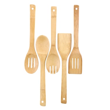 - <li>DURABLE WOODEN CUTLERY SET - 100% pure natural beech wood kitchen utensils with a thick and strong handle, perfectly sanded, smooth, lightweight, strong, and not coated. Made up of bamboo.<li>FULL SET - This 5 piece culinary set is perfect for every kitchen and includes a solid turner and slotted turner, spatula, slotted spoon, and kitchen spoon.<li>STRENGTH - Bamboo proves stronger than most commonly used hardwoods that are found in other kitchen utensils, but is also lightweight and practical with an oil coating.<li>EASY TO STORE & CLEAN - This Royalford 5pcs kitchen tool set is easy to clean as it is dishwasher safe and has a hanging hole to store.<li>0<li>Product Dimensions: 30 x 6 x 3 cm, 0.05 Grams