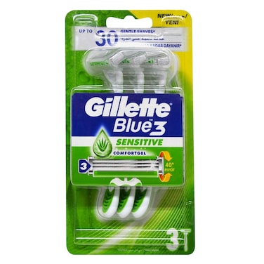 - Gillette Blue3 Sensitive disposable razors have 3 chrome-plated blades that “read” the skin and the moving head that adapts to the contours of your face.