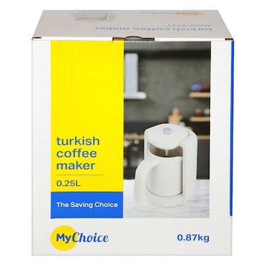 The MyChoice Turkish Coffee Maker MCM-271T in white is a stylish and functional addition to any kitchen. With a capacity of 0.25L, it is perfect for brewing a traditional cup of Turkish coffee with ease. The sleek design and compact size make it ideal for small spaces or for those who appreciate minimalist aesthetics.