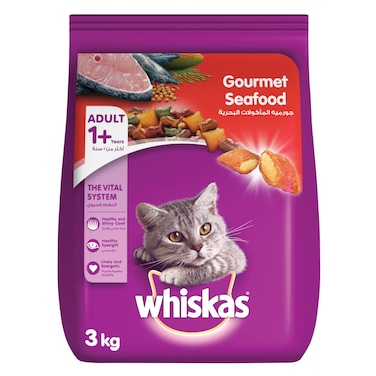 - <ul></li>HIGHEST LEVEL OF PROTEIN: Whiskas Gourmet Seafood kibbles include the highest levels of protein that form the most important source of energy in the dry food for cats so they can stay active and healthy!</li></li>PERFECTLY CATERED FOR ADULT CATS: Whiskas Gourmet Seafood Dry Food is a nutritionally complete and balanced recipe that has carefully been created to cater to the requirements of an adult cat’s system.</li></li>GLOWING SOFT FUR: Whiskas provides the needed high-quality diet to maintain their shiny coats. our formulas are complete with all the amino acids needed by cats to form healthy skin and hair cells. Ensures your cat always has a healthy glowing pretty fur.</li></li>CONVENIENCE FOR OWNERS AND CATS: Whiskas is convenient to keep and store once opened, due to its longer shelf life. Your cat will also find convenience in eating measured smaller volumes which is helpful for those that prefer to graze throughout the day.</li></li>AAFCO CERTIFIED: Formulated specifically to meet the nutritional levels established by the AAFCO cat food nutrient profiles for adult maintenance for a complete & balanced meal all in the Gourmet Seafood flavored kibbles for your fluffy feline friends!</li><ul>