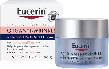 Eucerin Q10 Anti-Wrinkle Facial Night Cream + Pro-Retinol is a sensitive skin night cream that works while you sleep to help reduce the look of fine lines in as little as 5 weeks (1). This facial night cream is formulated with Coenzyme Q10, Vitamin E, Macadamia Nut Oil and Pro-Retinol to moisturize skin and soften the appearance of fine lines to defend against the signs of aging. This retinol night cream is specifically formulated to be non-irritating and gentle on sensitive skin. Eucerin Q10 Anti-Wrinkle Facial Night Cream + Pro-Retinol is non-comedogenic, fragrance free, and alcohol free, so it's safe to use on sensitive skin. To use, apply this Eucerin cream face moisturizer to the face and neck area. For best results, use every night. Eucerin is a dermatologist-recommended skincare brand that is based on an uncompromising approach to science. With skincare products designed to restore and sustain healthy-looking skin, families everywhere look to Eucerin to enhance outer beauty and self-confidence. (1) when used twice daily or in combination with the Eucerin Q10 Anti-Wrinkle Day cream.