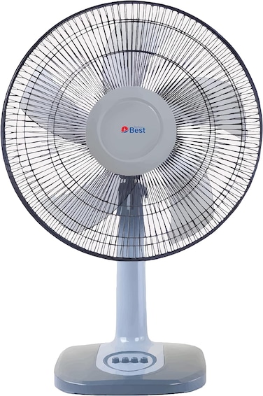 Techno BEST 16", 60 Watt Table FAN. Beautifully design in grey color. Large size made of AS 5-blades for strong air flow. 3 speed setting. Timer option for on/off. Solid base of 2.5 Kg