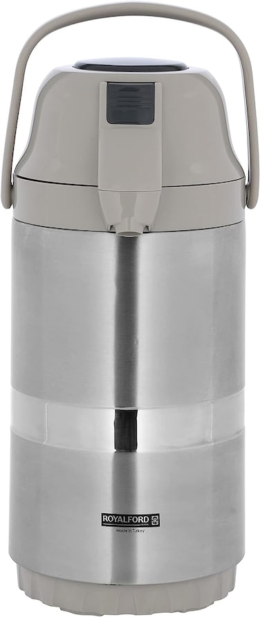 - <li>STAINLESS STEEL THERMOS – Stay hydrated with the Royalford Thermo Airpot Flask. This thermos is made from stainless steel outer body and Asbestos-free glass inner. It features a secure, leak-proof lid design to prevent messy spills. With a capacity of 2.50L, this insulated bottle takes care of your hydration needs for the whole day.<li>SIP WITH CONFIDENCE - Keep that drink piping hot for up to 12 hours or cold for up to 24 hours. And unlike other carafes that keep beverages in constant contact with plastic, our airpot coffee carafe has an interior that is asbestos-free glass. So your drinks never steep in plastic.<li>ALL-DAY CAPACITY - No more having to keep heating water for tea or preparing pots of coffee. Our double-walled thermal beverage dispenser has an ample capacity of 2.5L, enough for close to 5-6 cups of coffee. Perfect for use at home, in the office, or during parties.<li>DISPENSE WITH EASE - Just push down the button at the top and your favorite beverage comes streaming down the spout. This stainless steel thermos also comes with a base that conveniently rotates. This means no need to lift the coffee urn, just turn it in your direction.<li>GREAT FOR TRAVEL - Heading out on a road trip or a picnic Our thermal carafe dispenser ensures no accidental spills during transit. Just slide the push button to one side and it locks in place. The surface of the thermos always remains cool to the touch for added safety.<li>Product Dimensions: 21 x 21 x 37 cm, 1.9 Kilograms