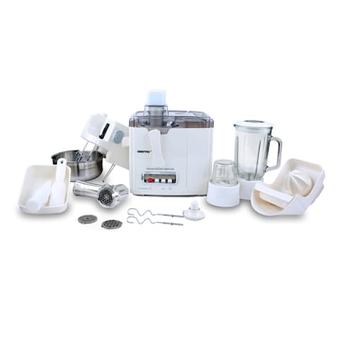400W PURE COPPER MOTOR, STAINLESS STEEL BLADES - Power your way through a wealth of different food preparation tasks with the Geepas 400W Food Processor & Blender. The blender has an efficient high-speed motor. This powerful 400 Watt copper motor does all chopping & grinding work with finesse. It gives the perfect smoothies, juices and blends. The machine has an outer body made of plastic. It has stainless steel blades to get the job done fast and quietly. They will serve you for many years with care2. OVERHEAT PROTECTION - Too much grinding work can make the machine turn very hot. It is dangerous for the appliance itself and also affects the functionality. This processor has an overheat protection system. It turns off the appliance when it is crossing a specified temperature limit.3. WIDE FEEDING TUBE, STAINLESS STEEL GRATER - This blender is having wide tube which is easy to fill in fruits, vegetable and more without any spills. And stainless steel grater is capable to perform its task efficiently.4. TWO SPEEDS WITH PULSE FUNCTION - 2 different speed modes to allow you to handle soft or hard ingredients properly. Speed 1 for Juicer, Speed 2 for Blender & Pulse function for Mincer. You can choose either to suit your needs & provides continuous speed, giving you a quick and easy way to prepare your food with precise and consistent results every time. The pulse function is best suited for making drinks and smoothies and adds an extra boost of power when you need it to achieve perfect texture.5. PACKAGING INCLUDES - Juicer Jar (5L), Chopper Jar, Coffee Jar, Citrus Juicer, Stand Mixer, kubbe maker, Meat grinder, Beater, Bowl, Meat grinder for coarse, medium and fine and 600W Blender.