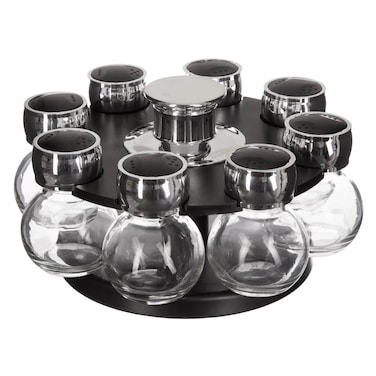 Space-saver design ensures a clutter-free table. Rotating holder decked with see-through containers allows you to conveniently choose your spice. Transparent containers for easy access and pick.