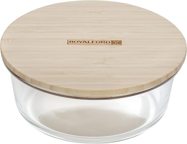 RoyalFord Airtight Round Glass Container is made of high-quality borosilicate glass with a 100% natural bamboo lid. Entirely safe to transfer from the freezer to the oven in instants. Glass containers won't absorb stains or smells, making it the perfect choice for acidic foods. A glossy surface maintains the tastiness of food for long periods. Borosilicate glass is safe for baking in the oven, freezer storage, and reheating. The modular stackable design allows for neat packing in a lunch bag or for storing leftovers in the freezer. RoyalFord Airtight Glass Container with locking tabs secures the leak-proof lids, BPA-free, secure-snap lid with silicone ring ensures airtight seal for food freshness and 100% leak-proof ability for mess-free transport on-the-go, to the gym, work, and school. This glass container with a lid for food storage is dishwasher safe (top shelf recommended) and super easy to hand wash, and can be inserted in the dishwasher too. You can use this glass container for storing, freezing, reheating, baking, and serving. It suits homemade baby food, for last night's leftovers, for taking lunch on the go and for packing snacks. Capacity: 1350 ml.