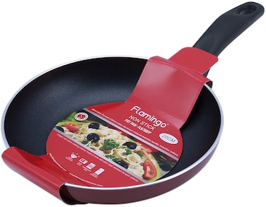 Flamingo fry pan 20 cm 20*4cm Fry pan Finish : 2-layer non-stick coating interior and wine red color heat resistant lacquer exterior. Thickness: 3.0mm Handle : Bakelite handle, bottom: induction,