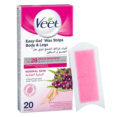 Veet Professional Hair Removal Easy-Gel Legs & Body Wax Strips With Shea Butter For Normal Skin, Perfect Finish Wipes With Argan Oil, Up To 28 Days Of Smoothness, 20 Wax Strips (Pack May Vary)
