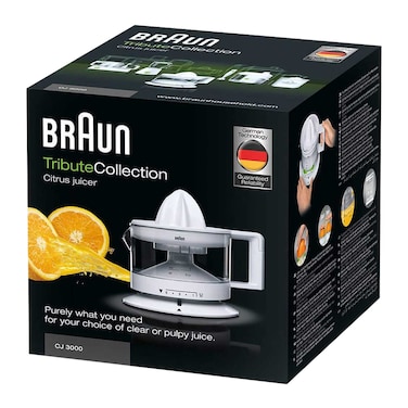 The Braun Citrus Juicer with Scale Auto Stop Adjustable Pulp Control CJ 3000 is a must-have kitchen appliance for anyone who loves fresh citrus juice. With a 350ml capacity, this juicer makes it easy to enjoy a glass of freshly squeezed juice anytime you want.