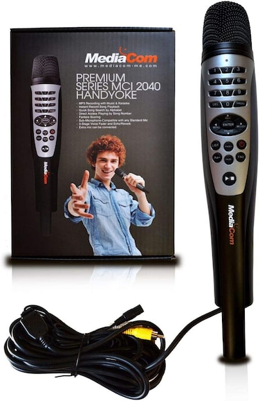 Quick Song Search by Alphabet Mediacom Karaoke System is ergonomically designed to pump up your party to make it memorable. Buy this karaoke player from Souq.com. The MediaCom MCI 2040 Premium Handheld Karaoke Player has incredible features to give you a satisfying performance. The easy to use player features a mic that has various buttons to choose from and perform individual functions while singing. This system has over 15,000 songs in multiple languages for your utmost convenience and enjoyment. You also have the liberty to record clips and save for later use with the MP3 Karaoke Recording facility. Not to worry if you are unable to search your favorite song on the system as you can find it with the alphabet search grid. Key Features32GB SD with more than 15,000 songs in various languagesMP3 Karaoke RecordingInstant Record Song PlaybackQuick Song Search by AlphabetLive Scoring Sing Like a Pro The Karaoke System features an SD card with a large memory of up 32GB, which can accommodate various songs in different languages such as English, Tagalog, Hindi, Urdu, Malayalam, Tamil, Telugu, Konkani, Kannada, and more. You can easily get access to any song by playing the song number. This Karaoke player also allows you to download any song of your choice from the Internet and can prepare a library or playlist. Compact and Convenient The MediaCom karaoke player sports a stylish and compact frame, which enables a comfortable grip. It facilitates a live scoring feature and a sub microphone that is compatible with any standard mic for which a mic plug converter is needed. The Karaoke System has an extra cord mic that allows two people to sing at once.
