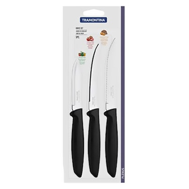 The Tramontina Plenus Premium Kitchen Knife 3 PCS set is a must-have for any kitchen. This set includes three high-quality knives that are perfect for all of your cooking needs. The knives feature a sleek black design and are made from durable stainless steel. The ergonomic handles provide a comfortable grip making it easy to slice dice and chop. Whether you're a professional chef or just love to cook at home this knife set is a great addition to your kitchen.