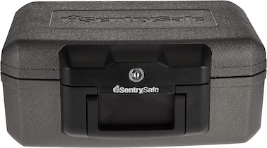FIRE RESISTANT BOX: Keep your important papers, digital media and other valuables secure and protected from fire with this durable fireproof safety box for home. ADVANCED FIRE PROTECTION: Fire safe box is UL classified for fire endurance (1/2 hour at 1550ºF) to protect documents and valuables, ETL verified (1/2 hour at 1550ºF) to protect CDs, DVDs, memory sticks and USB drives. KEY LOCK: Fire resistant safe has a privacy key lock to keep unwanted viewers away and prevent the lid from opening in the event of fire, includes two keys and bolt-down hardware for added security. CARRYING GRIPS: Convenient carrying grips on fire resistant safe assist with ease of transportation and portability. SMALL FIRE SAFE: Safety box fits wherever you need, Interior: 3.5 in. H x 12 in. W x 7.5 in. D, exterior: 6.1 in. H x 14.3 in. W x 11.2 in. D