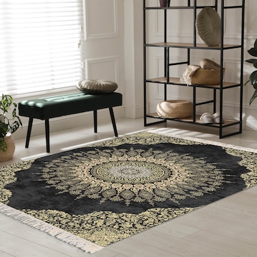 In House Velvet Turkish Rectangular Decorative Carpet - Gold & Black - 120x80cm
