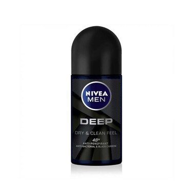 NIVEA MEN Antiperspirant Roll-on for Men, 48h Protection, DEEP Black Carbon Antibacterial, Woody Scent, 50ml