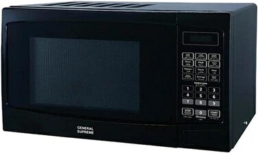 General Supreme Microwave with Grill Function gives you a convenient and hassle-free way to cook your food with the 6 Auto Cook Menu and 11 adjustable power levels. Pressure switch to open the door. Child safety lock. LED display screen. Warning of the completion of the cooking process. With a capacity of 25 Litres, this microwave oven is ideal for your day-to-day cooking needs. Inner cavity is gray painted and external body is silver-plated. Colour: Black. Glass rotating plate: 315 mm.