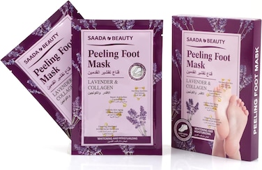 The Saada Beauty Lavender and Collagen Peeling Foot Mask is enhanced with essential extracts to easily remove dead tissue. This gently exfoliates the skin, leaving the feet soft and healthy. It is removes impurities and dead skin cells. This gives the skin a smooth and rejuvenated appearance. This comes in 40 gram weight.