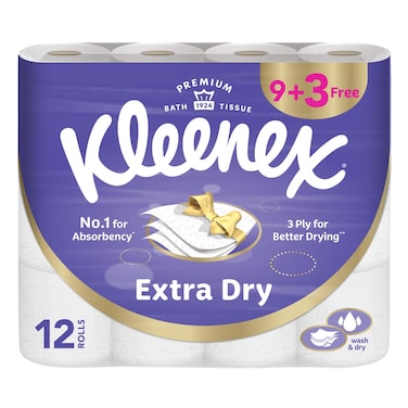 Kleenex Extra Dry Toilet Tissue Paper, 3 PLY, 12 Rolls x 160 Sheets, Embossed Bathroom Tissue with Superior Absorbency