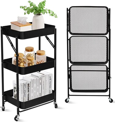 3 Tier Foldable Metal Rolling Utility Cart Organizer-black