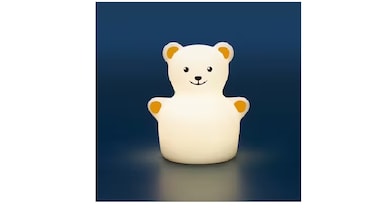With the built-in timer you can choose if the lamp should turn off after 30 minutes or 8 hours. Your child can easily turn the lamp on and off by themselves – and change the colour of the light by pressing on the animal's smooth surface. Your child can decide on one colour or let the light switch automatically between 5 different colours. The lamp can illuminate in 5 different colours: red, yellow, orange, green and white. They all make your child relax and fall asleep calmly. Light in warm colours like red and orange makes the body produce the hormone melatonin, which causes us to relax and get sleepy. Cold colours like blue have the opposite effect. To prevent your child from waking up when the lamp turns off, the light dims slowly during the last 15 minutes. On one side of the lamp the bear's eyes are open and his ears are bright yellow, and on the other side it has closed eyes and green ears. The bulb has a lifetime of around 25,000 hours. This corresponds to approximately 8 years if the lamp is on for 8 hours per night.