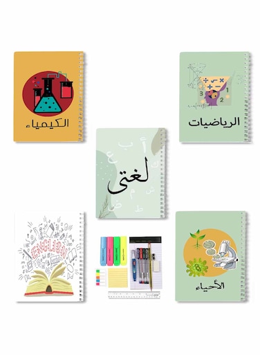 Lowha Set Of 5 Spiral Notebooks For School, 60 Sheets With Hard Paper Covers For Arabic, English, Math, Chemistry, Biology With A Set Of School Supplies