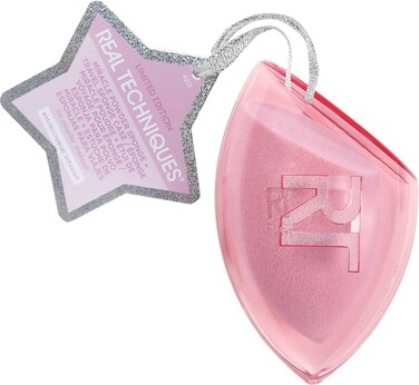 Make your glow last with the Real Techniques Miracle Powder Sponge + Travel Sponge Case Ornament! The Real Techniques Miracle Powder Sponge features revolutionary foam technology paired with proprietary velvety material for maximum pickup, evenly blended powder and now features an antimicrobial infusion to keep skin healthy! Seamlessly set powder foundation for a matte base. Rounded side for blending, flat edge for baking, pointed tip for coverage dab bounce blend use wet or dry with powders.