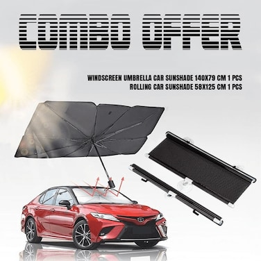 Step up your car's protection against the blistering sun with our exclusive Combo Offer, featuring a windscreen umbrella car sunshade coupled with a rolling car sunshade. This innovative duo is engineered to shield your car’s interior from the sun's damaging effects, significantly reducing the temperature inside your vehicle while preserving the life of your upholstery. The umbrella sunshade, measuring 140x79 cm, offers the simplicity of an umbrella with the protective benefits of a traditional sunshade.