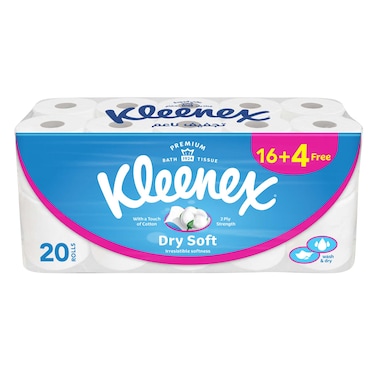 Kleenex Dry Soft Toilet Tissue Paper, 2 PLY, 20 Rolls x 200 Sheets, Embossed Bathroom Tissue with a Touch Of Cotton