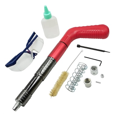 Steel Nail Gun or Rivet Gun Tool Set designed for fastening purposes on materials such as brick walls. It includes a red handheld nail gun with a contoured grip for comfortable handling. The set is organized in a red, durable plastic case with designated slots for each component, ensuring tools are secured and easily accessible. The kit appears to contain a wire slotting device, a brush for cleaning, a transparent oil bottle for maintenance, and a set of metal fasteners or rivets. The device operates through a trigger mechanism, suggesting manual operation, and the presence of springs and a wire guide indicates a mechanism for driving nails or rivets into a surface with precision. This tool set is typically used for home improvement tasks, such as fixing wires to walls or tufting materials, offering a practical solution for DIY enthusiasts or professionals in construction or upholstery.