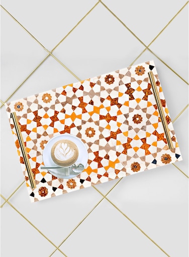 Lowha Decorative Acrylic Serving Tray With Gold Metal Handles And Inlay And Carvings Design 20x30 cm