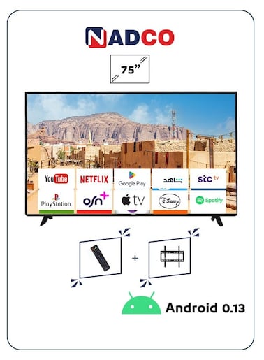 Nadco Smart Screen, 75 Inch, Android 0.13, 4K, UHD With Remote Control And TV Stand, NC, 75T, 4K