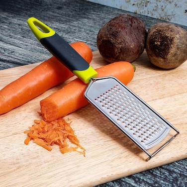 - <li>1. STUDY STAINLESS-STEEL & ULTRA SHARP BLADES - The Stainless Steel blades are sturdy, long-lasting, sharp, and offers high efficiency.<li>2. NON-SLIP GRIP, COMPACT STORAGE - The large, non-slip handle fits any size palm and absorbs pressure away from hands, making easy to grate things easily. And it is compact for easy storage in a drawer, or it can be hung up using the handy oversized hole.<li>3. ERGONOMIC DESIGN & GRIP- Premier quality tool designed for ease of use and hold. The thick, soft, rubber, handle fits perfectly in your hand giving you excellent grip making grating foods a breeze!<li>4. EASY USE, EASY CLEANING – Grating is done in a unique etching technique, and the planning teeth are evenly distributed and sharp, easy to graze and grate foods such as citrus, chocolate, hard cheeses and more into fine medium textures. And it is very easy to clean and dishwasher safe.<li>5. MULTIPURPOSE - Cheesegrater for zesting or grating lemon, lime, orange, citrus, cheese, chocolate, nut, ginger, garlic, carrots, vegetables etc.