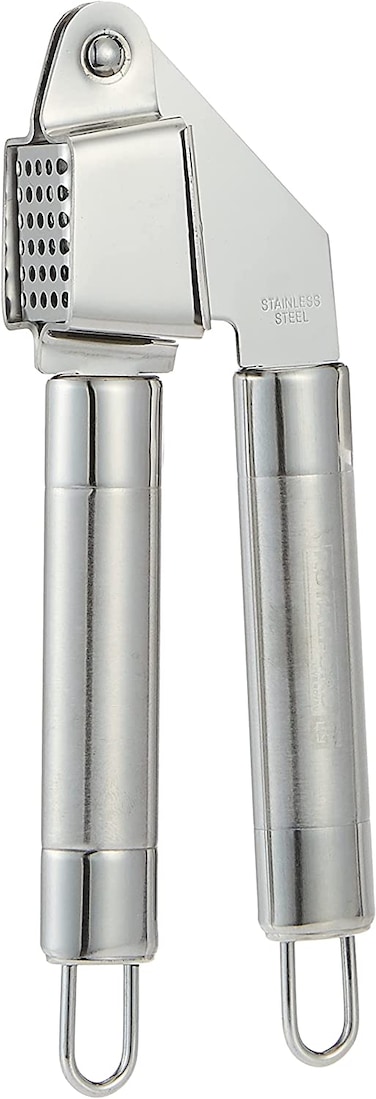 - <li>STAINLESS STEEL CONSTRUCTION WITH STAINLESS STEEL HANDLE - Made of premium quality stainless steel, that gives it strength and makes it more durable, lasting year after year without any corrosion. To get plenty of chopped garlic requires only one simple press. It will help you to press fresh and healthy garlic when cooking and convenient for big fresh garlic users. And a-must-have kitchen aid in terms of both function and beauty. A premium, great gift for Moms, Cooks, and health-conscious people!<li>MULTI-FUNCTIONAL USE - Besides garlic, you can press ginger to add more flavor to your dishes. Press Maximum Garlic Out nice and even and barely leave pulp behind. Strong and lightweight, this garlic press fits perfectly in the hand, making light work of crushing garlic cloves. You can also crush the garlic without peeling - so you avoid garlic smell on your fingers. Prepare homemade garlic bread, rich pasta sauce, mouth-watering hummus, oven roast veggies, and mashed potatoes with ease.<li>EASE OF USE, ERGONOMIC STAINLESS STEEL HANDLES -The handles has a comfortable grip and it presses the garlic out efficiently and easier than ever. A handy tool with Ergonomic stainless steel handle design makes cooking more convenient and efficient. With an ideal distance apart to maximize leverage, you can easily mince unpeeled garlic cloves, ginger or other things effortlessly. Make juicy garlic mince instantly without peeling off the garlic and say goodbye to stinky smelly "garlic hands".<li>DISHWASHER-SAFE - Thanks to the heavy duty construction and ergonomic design, you can easily mince both unpeeled garlic cloves and peeled root ginger. The large, comfortable handles and ingenious design make squeezing a breeze, even for those with weaker grip or small hands. What’s more, clean-up is super simple too. This product is dishwasher safe, which means you can put it in a dishwasher for cleaning it, without the fear of damaging it.