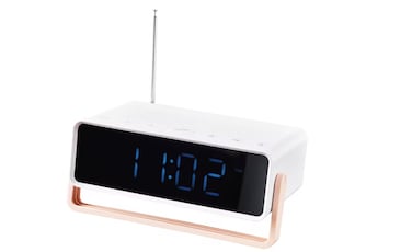 - <p>Alarm clock radio/bluetooth speaker, white/light pink16x5 cm